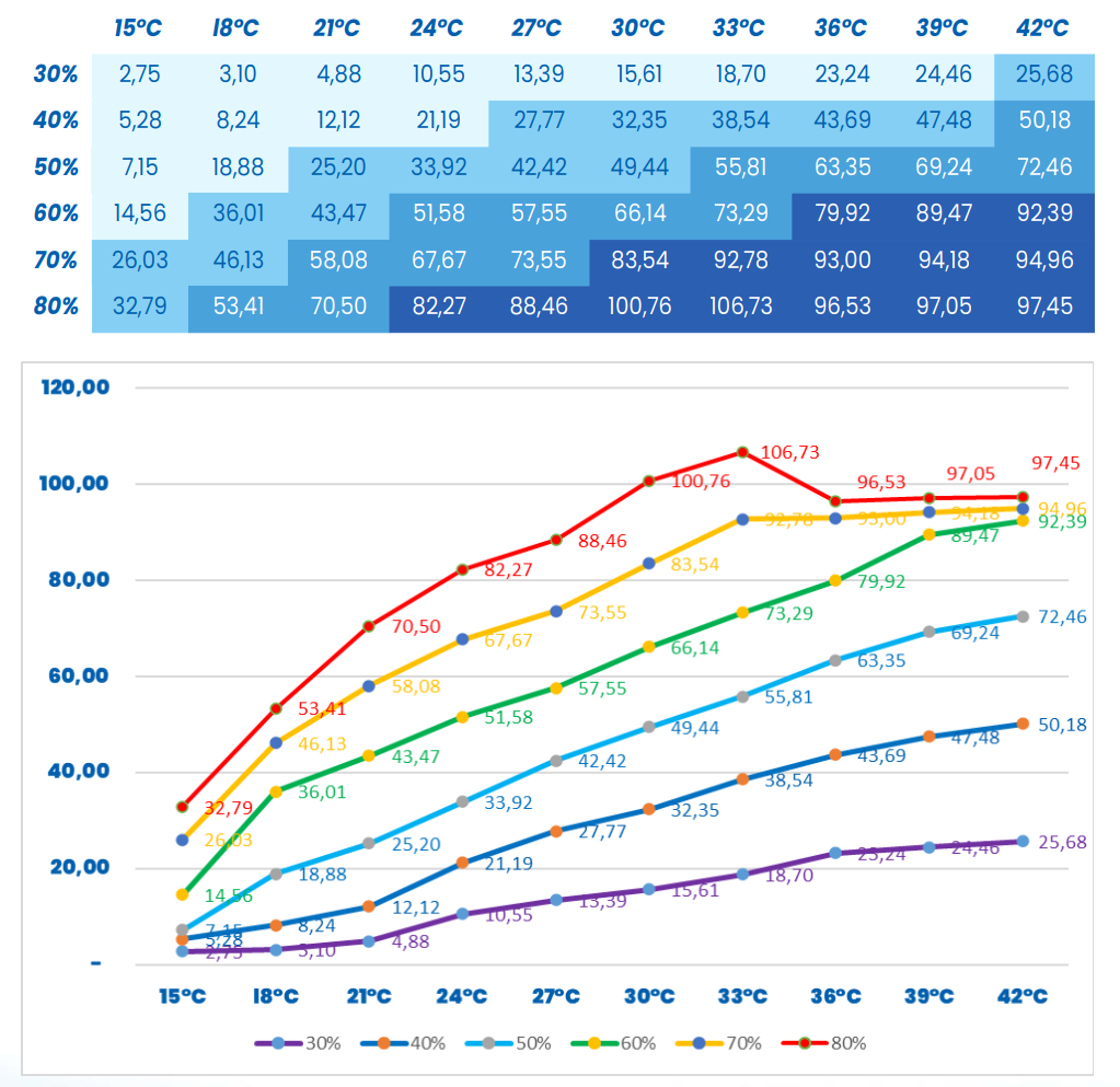 Water generation capacity (liters/day) of AguaPARS MISTRAL, depending on humidity and temperature conditions