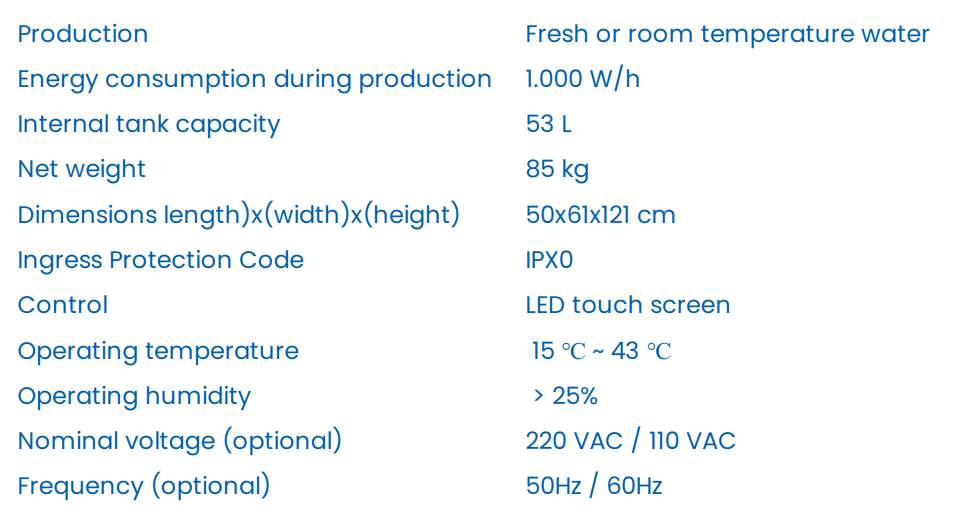 The water production capacity of atmospheric water generators (AWGs) is significantly influenced by ambient temperature and humidity levels. Here's a general overview: Temperature: AWGs perform best at higher temperatures, typically between 25°C and 35°C. Colder temperatures reduce the amount of water vapor in the air, which can lower production efficiency. Humidity: Relative humidity is a critical factor. AWGs usually require a minimum of 30% relative humidity to function effectively, with optimal performance at 60% or higher. Here you can see some examples of the water production capacities of the AquaPARS MISTRAL model generator in different environmental conditions.
