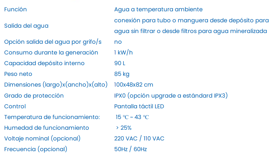 1. Control: Pantalla táctil LED 2. Temperatura de funcionamiento: 15 ℃ ~ 43 ℃ 3. Humedad de funcionamiento: > 25% 4. Plug and play, sin instalación, ni trabajos de fontanería. 5. Recordatorio automático de fin de vida útil de los filtros. 6. Desinfección regular y filtración por circulación para obtener agua potable segura. 7. Con dos Salida de agua: salida de agua con una bomba interna y otra salida en el fondo del depósito para conectar mediante tubería a una bomba o depósito externo. 8. Se puede personalizar a petición del cliente, para separar salidas de agua filtrada y agua sin filtrar. 9. Se puede personalizar a petición del cliente, para instalar grifos de agua potable a lado del generador. 10. Se puede personalizar a petición del cliente con grado de Resistencia al agua rociada IPX3, de lo contrario, el generador debe instalarse en un lugar bajo techo que esté completamente protegido de la nieve, la lluvia y la luz solar directa.