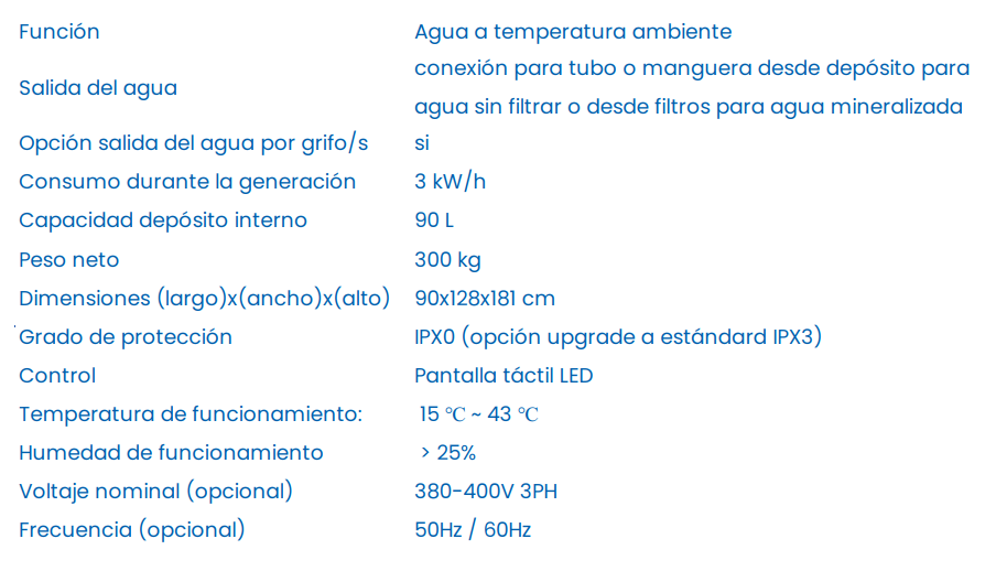 1.Control: Pantalla táctil LED 2.Temperatura de funcionamiento: 15 ℃ ~ 43 ℃ 3.Humedad de funcionamiento: > 25% 4. Plug and play, sin instalación, ni trabajos de fontanería. 5. Recordatorio automático de fin de vida útil de los filtros. 6. Desinfección regular y filtración por circulación para obtener agua potable segura. 7. Con dos Salida de agua: salida de agua con una bomba interna y otra salida en el fondo del depósito para conectar mediante tubería a una bomba o depósito externo. 8. Se puede personalizar a petición del cliente, para separar salidas de agua filtrada y agua sin filtrar. 9. Se puede personalizar a petición del cliente, para instalar grifos de agua potable a lado del generador. 10. Se puede personalizar a petición del cliente con grado de Resistencia al agua rociada IPX3, de lo contrario, el generador debe instalarse en un lugar bajo techo que esté completamente protegido de la nieve, la lluvia y la luz solar directa.