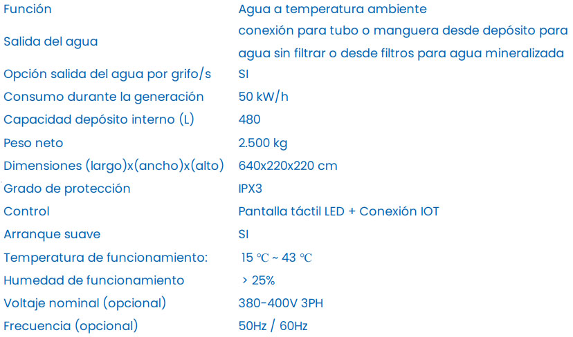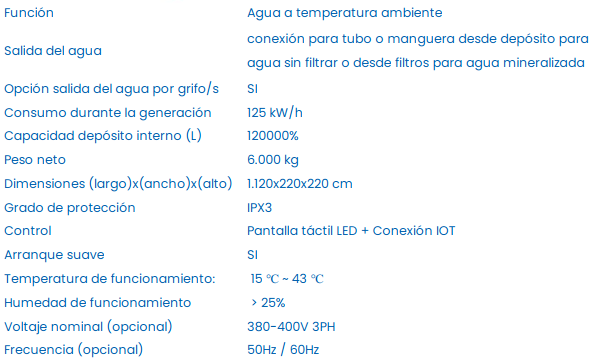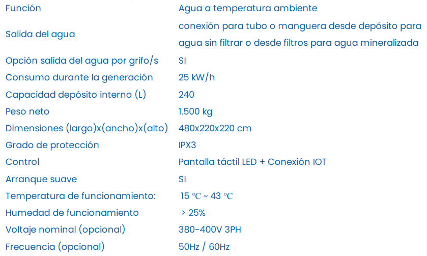 1. Control: Pantalla táctil LED 2. Temperatura de funcionamiento: 15 ℃ ~ 43 ℃ 3. Humedad de funcionamiento: > 25% 4. Plug and play, sin instalación, ni trabajos de fontanería. 5. Recordatorio automático de fin de vida útil de los filtros. 6. Desinfección regular y filtración por circulación para obtener agua potable segura. 7. Con dos Salida de agua: salida de agua con una bomba interna y otra salida en el fondo del depósito para conectar mediante tubería a una bomba o depósito externo. 8. Se puede personalizar a petición del cliente, para separar salidas de agua filtrada y agua sin filtrar. 9. Se puede personalizar a petición del cliente, para comenzar a generar agua a partir de 5 ℃ de temperatura ambiente. 10. Se puede personalizar a petición del cliente, para instalar grifos de agua potable a lado del generador.