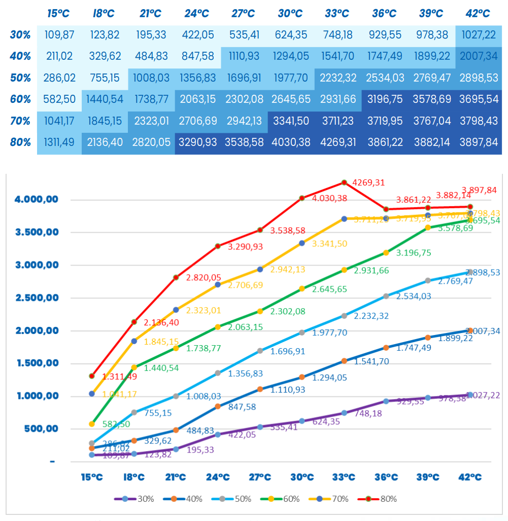 Capacidad de generación de agua (litros/día) de AguaPARS AP-8000, según condiciones de humedad y temperatura