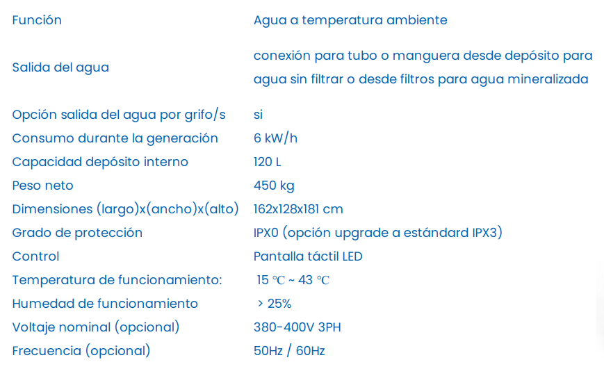 1. Control: Pantalla táctil LED 2. Temperatura de funcionamiento: 15 ℃ ~ 43 ℃ 3. Humedad de funcionamiento: > 25% 4. Plug and play, sin instalación, ni trabajos de fontanería. 5. Recordatorio automático de fin de vida útil de los filtros. 6. Desinfección regular y filtración por circulación para obtener agua potable segura. 7. Con dos Salida de agua: salida de agua con una bomba interna y otra salida en el fondo del depósito para conectar mediante tubería a una bomba o depósito externo. 8. Se puede personalizar a petición del cliente, para separar salidas de agua filtrada y agua sin filtrar. 9. Se puede personalizar a petición del cliente, para comenzar a generar agua a partir de 5 ℃ de temperatura ambiente. 10. Se puede personalizar a petición del cliente, para instalar grifos de agua potable a lado del generador. 11. Se puede personalizar a petición del cliente con grado de Resistencia al agua rociada IPX3, de lo contrario, el generador debe instalarse en un lugar bajo techo que esté completamente protegido de la nieve, la lluvia y la luz solar directa.