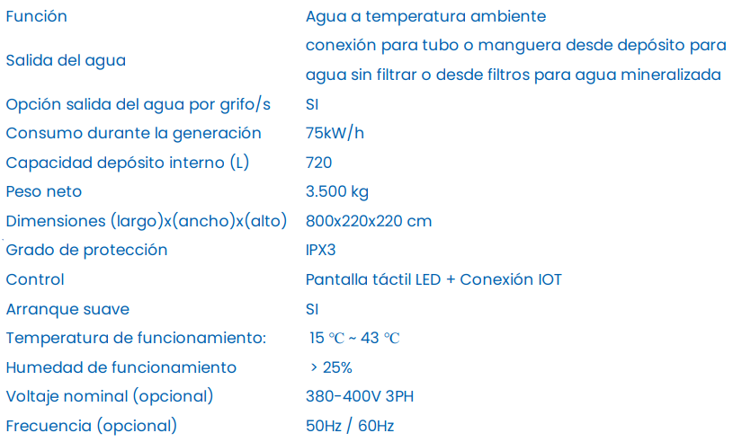 1. Control: Pantalla táctil LED 2. Temperatura de funcionamiento: 15 ℃ ~ 43 ℃ 3. Humedad de funcionamiento: > 25% 4. Plug and play, sin instalación, ni trabajos de fontanería. 5. Recordatorio automático de fin de vida útil de los filtros. 6. Desinfección regular y filtración por circulación para obtener agua potable segura. 7. Con dos Salida de agua: salida de agua con una bomba interna y otra salida en el fondo del depósito para conectar mediante tubería a una bomba o depósito externo. 8. Se puede personalizar a petición del cliente, para separar salidas de agua filtrada y agua sin filtrar. 9. Se puede personalizar a petición del cliente, para comenzar a generar agua a partir de 5 ℃ de temperatura ambiente. 10. Se puede personalizar a petición del cliente, para instalar grifos de agua potable a lado del generador.
