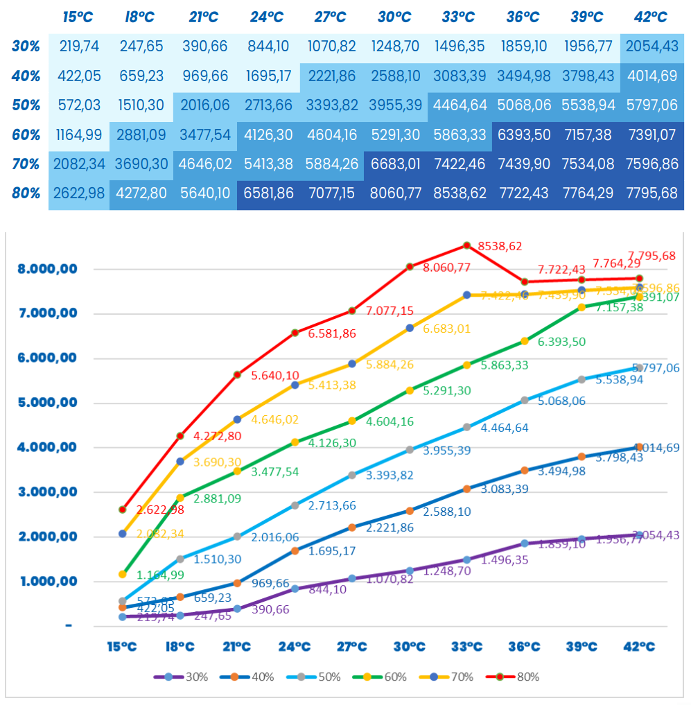 Capacidad de generación de agua (litros/día) de AguaPARS AP-8000, según condiciones de humedad y temperatura
