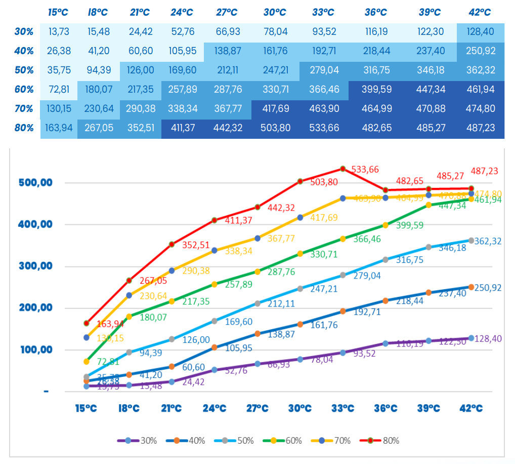 A continuación, puede ver algunos ejemplos de las capacidades de producción de agua del generador modelo AquaPARS SIROCCO en diferentes condiciones ambientales.